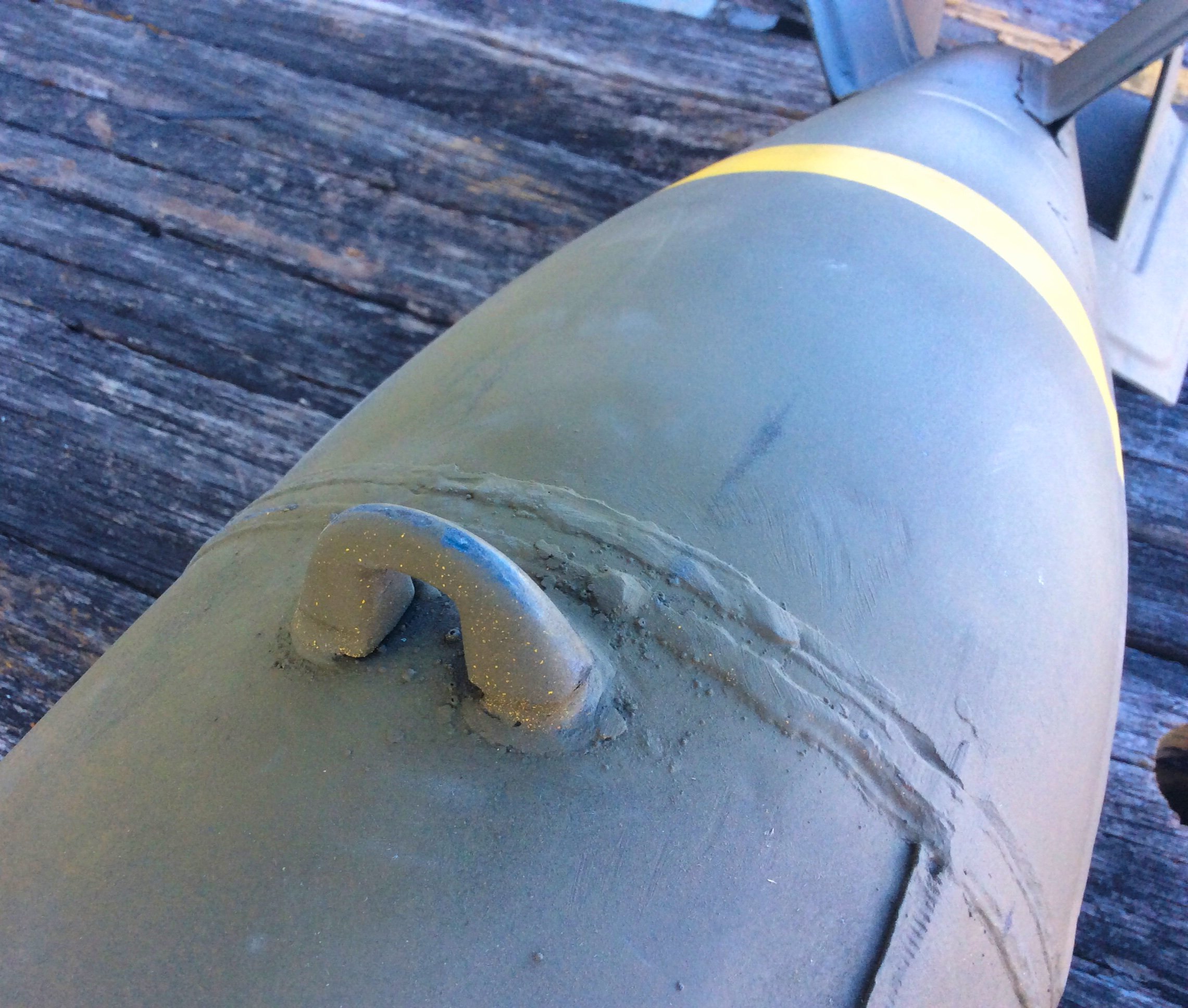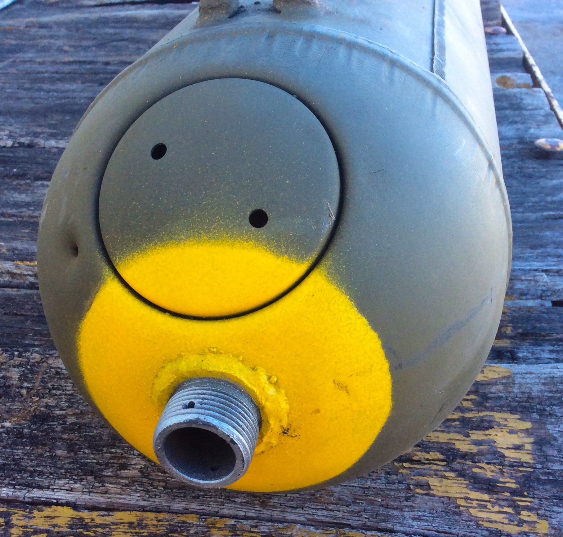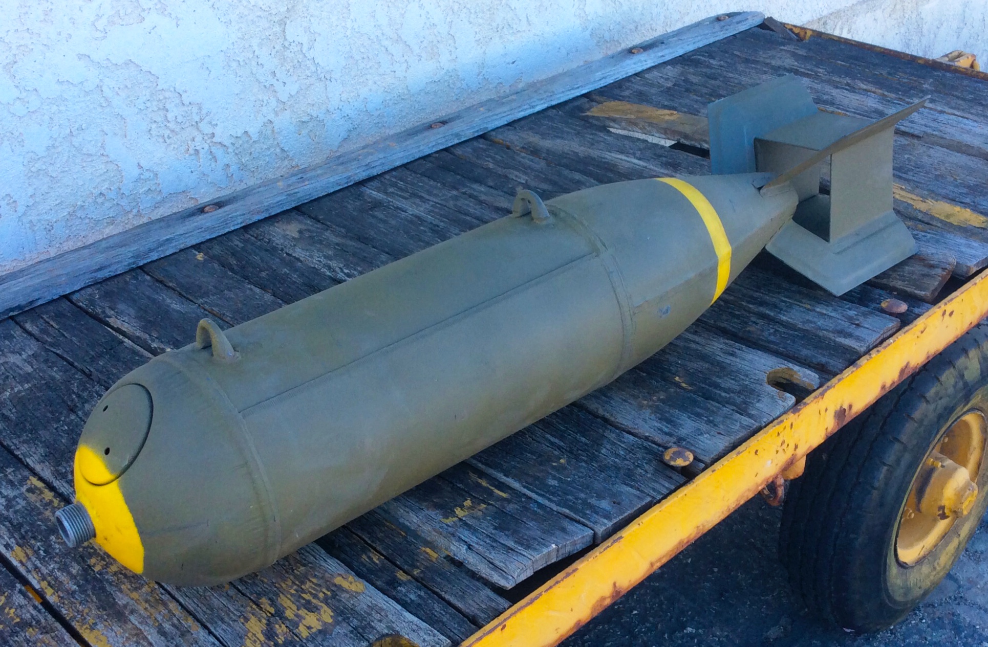 The MK-15 MOD 4 is a practice bomb used in the 60-70’s. There are 2 Army suspension lugs 14” apart. The paint and stenciling is all original. The bomb was designed for practice and is non explosive. They were filled with sand and water. There are no dents and the fins are straight.