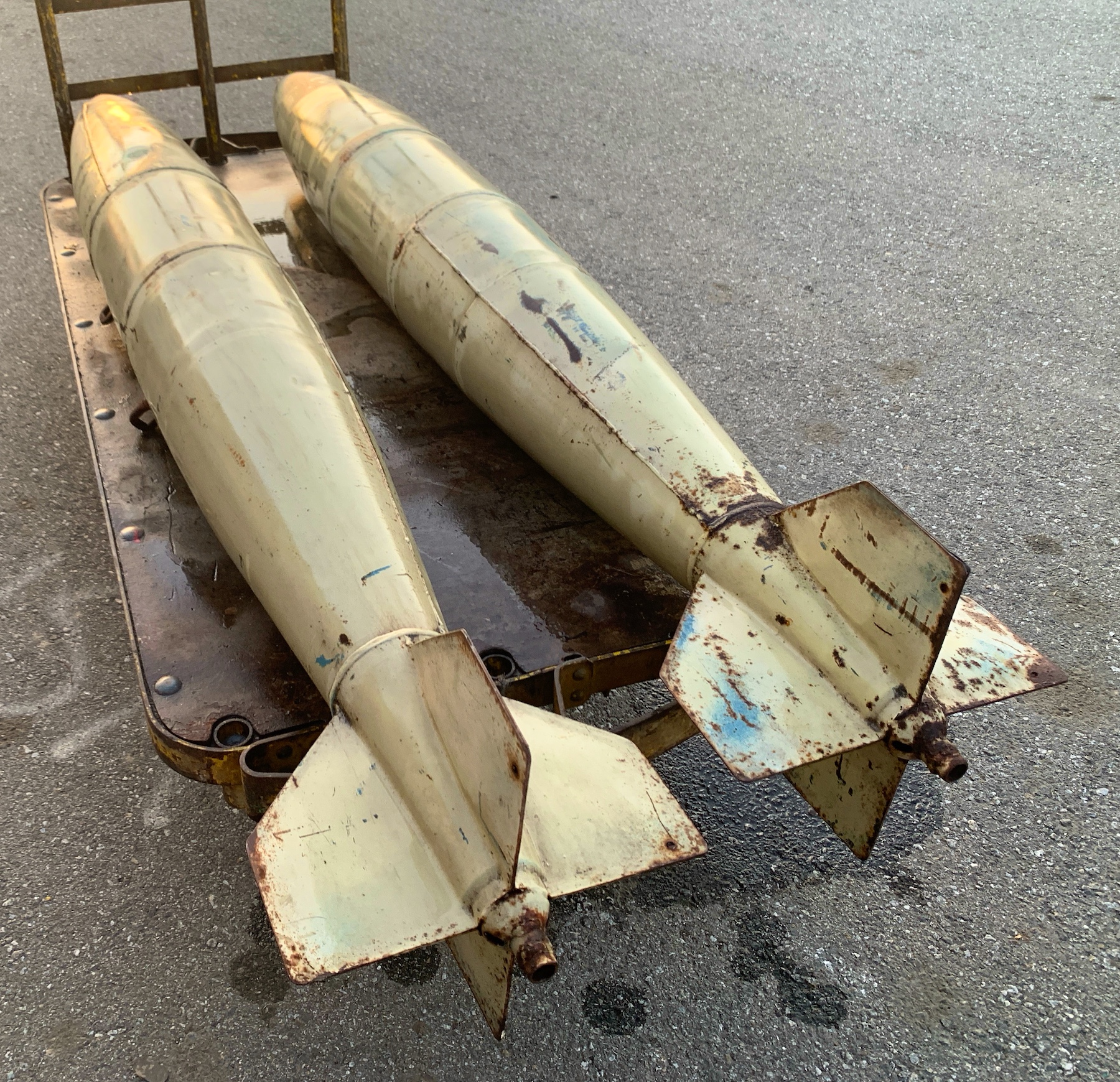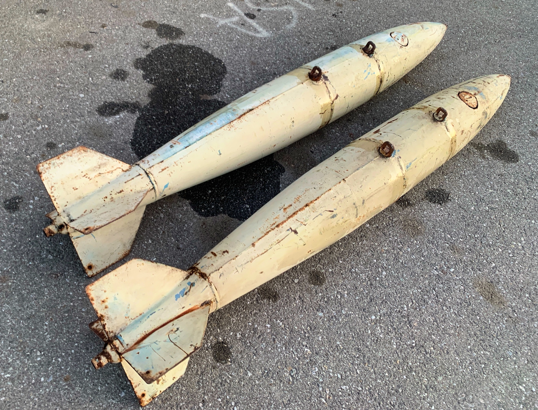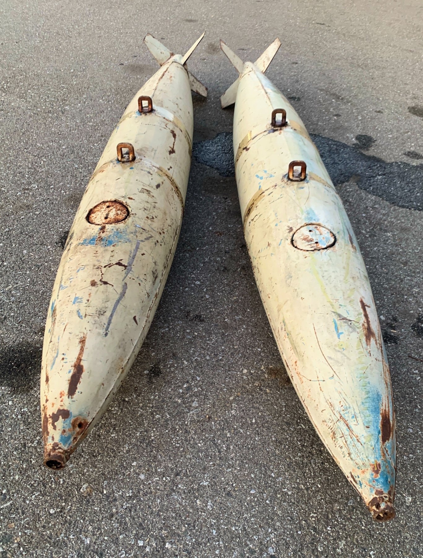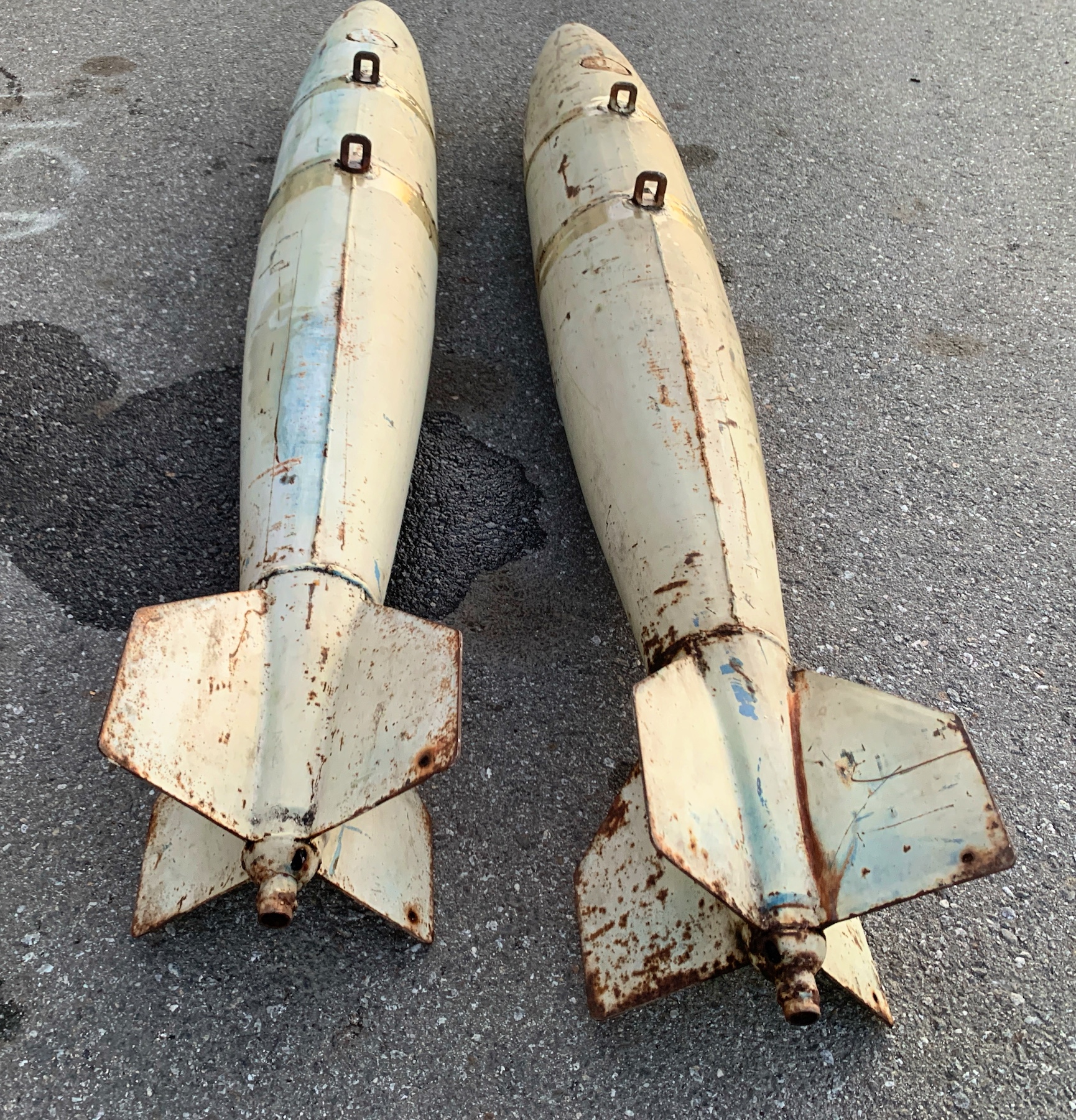 The MK-82 was used starting in the 60’s. (MK-82 is the model number of the real ordnance used in Vietnam war and after. These are authentic military light weight practice bombs, not the GP explossive and not replicas. I'm not sure what the practice model number is. There are 2 Army suspension lugs 14” apart. The bomb was designed for practice and is non explossive. They were filled with sand and water. There are a couple small dents. They will need to be painted.