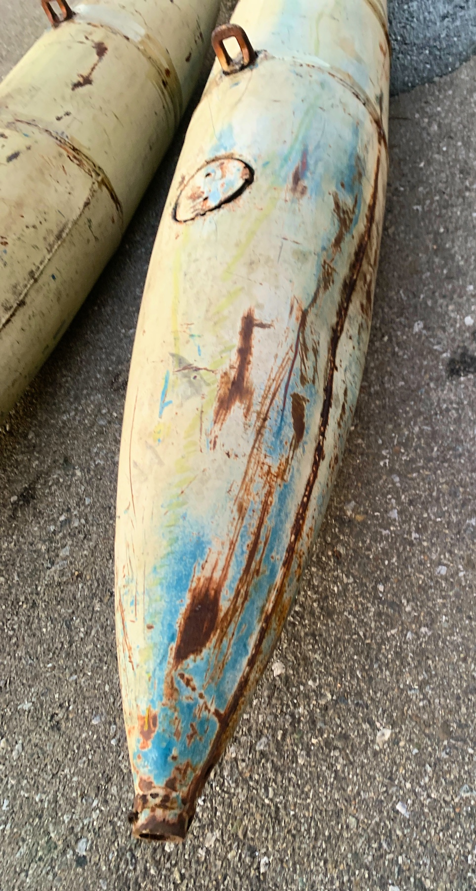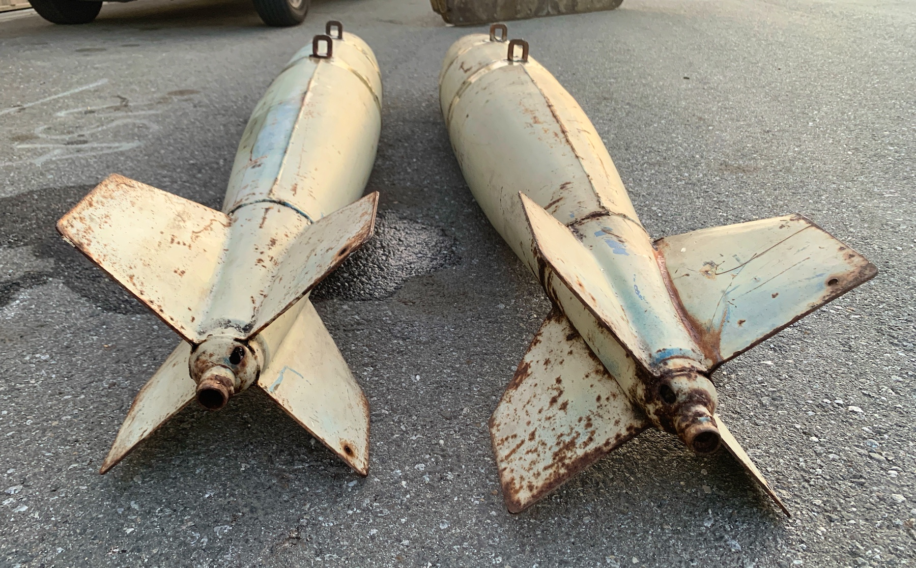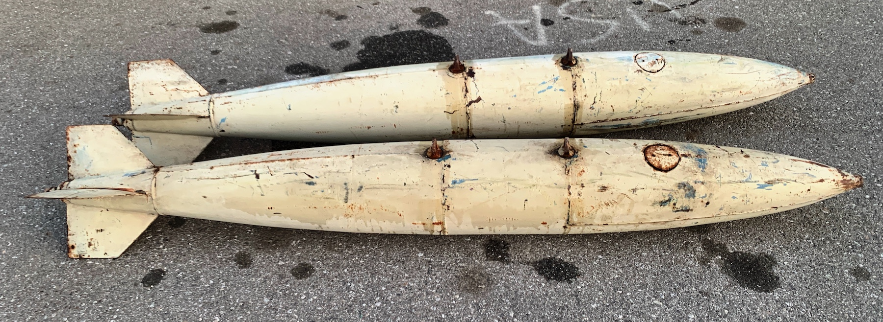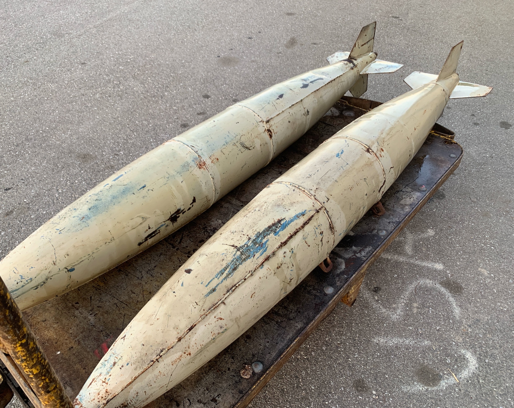 The MK-82 was used starting in the 60’s. (MK-82 is the model number of the real ordnance used in Vietnam war and after. These are authentic military light weight practice bombs, not the GP explossive and not replicas. I'm not sure what the practice model number is. There are 2 Army suspension lugs 14” apart. The bomb was designed for practice and is non explossive. They were filled with sand and water. There are a couple small dents. They will need to be painted.