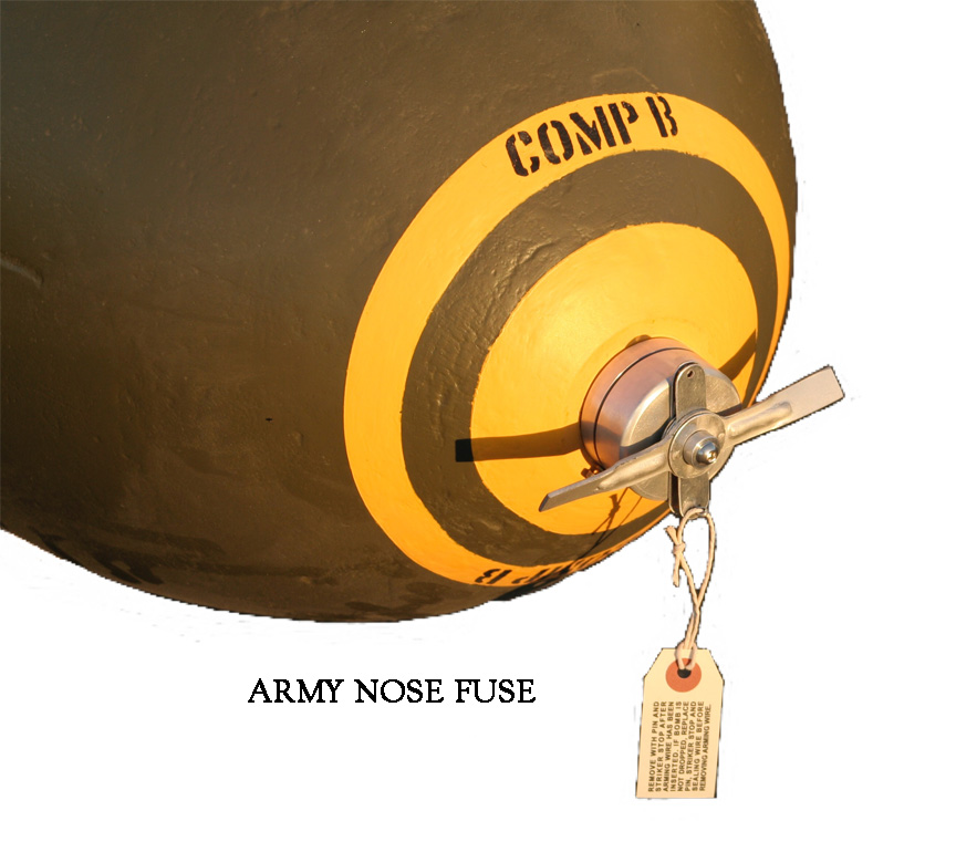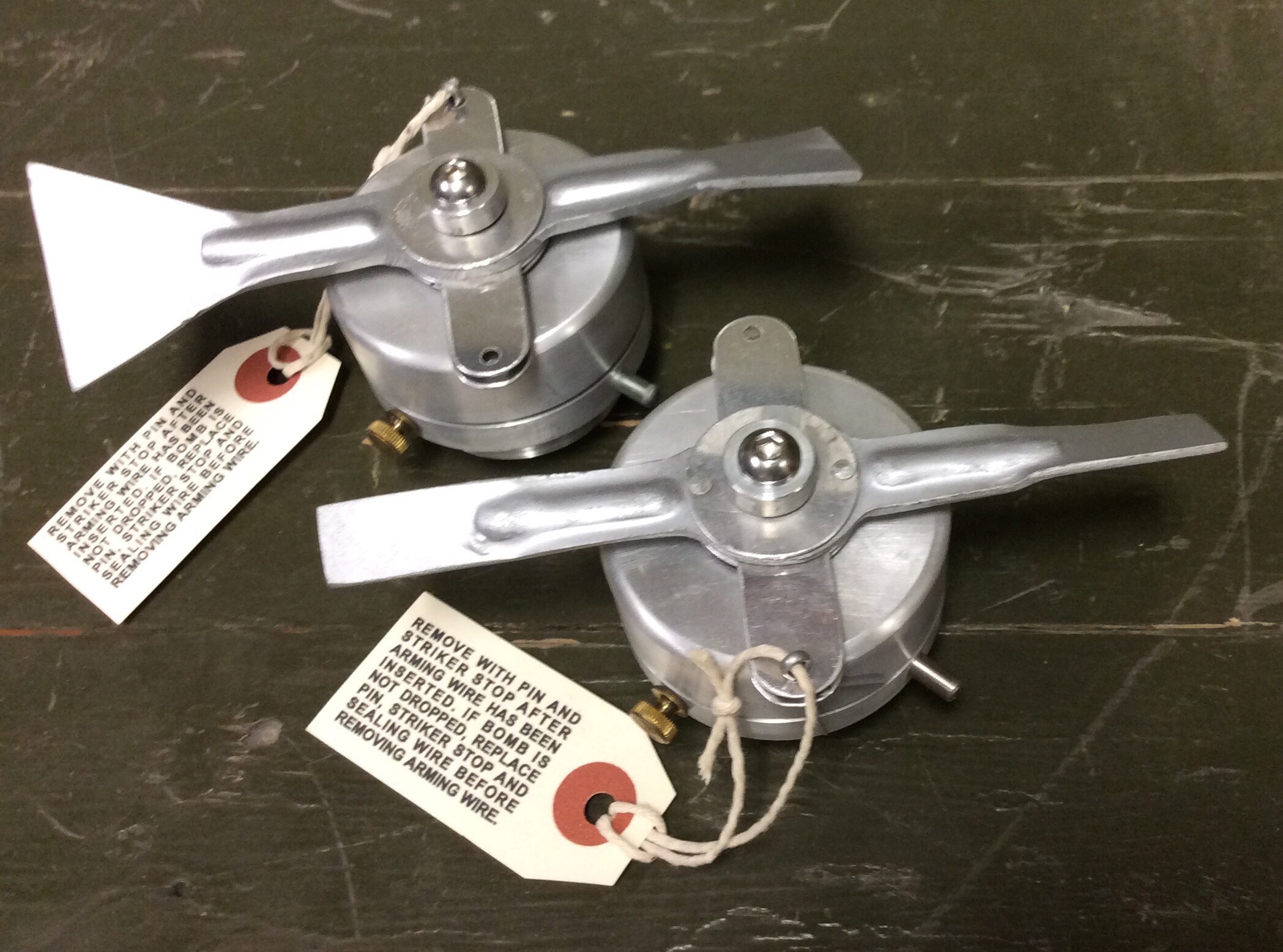 Principle of Operation: During bomb’s release from the aircraft, the propeller (vane) rotates, allowing an impeller to spin. After a certain number of revolutions, the fuse becomes armed, allowing it to function. When the bomb impacts the target, the firing pin punches the detonator causing it to detonate, activating the booster charge, which causes the main charge to function. These bombs are equipped with nose and tail fuses. The common nose fuse is the AN-M103 and the tail fuse is the AN-M101A2.
